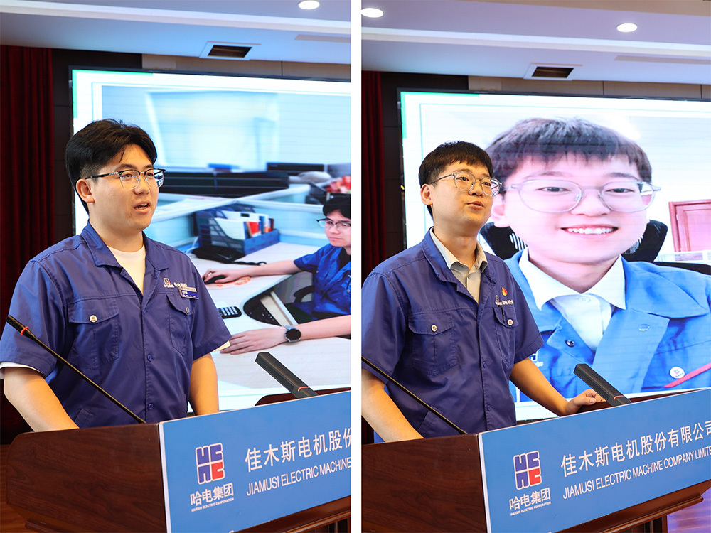 2名青年人才代表进行分享发言,建议新同事要调整心态融入团队、学会倾听和提问、注重细节和效率、勇于面对困难和挑战,与公司携手并进、共同发展。