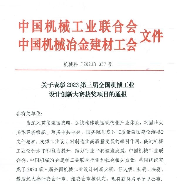 全国机械工业设计创新大赛由中国机械工业联合会、中国机械冶金建材工会联合主办,大赛以“设计创新、智造未来”为主题,旨在深入贯彻强国战略,加快构建我国现代化产业体系,巩固壮大实体经济根基,发挥工业设计对制造业高质量发展的牵引作用,促进机械工业设计水平和能力提升,助力行业平稳健康发展。