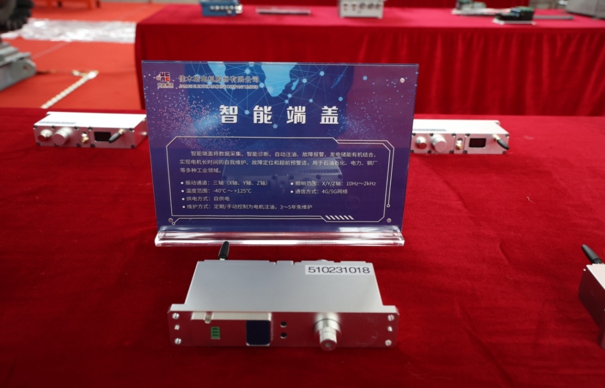 此次发布会展出的智能端盖,端盖内置发电机,为边缘智能终端供电,无需外接电源,解决续航问题,边缘智能终端嵌入安装端盖中,实时采集振动、温度数据,数据采集更精准,对多种故障实现早期预警及智能诊断,该端盖专为各类高、低压电动机设计,适用于各类工业场景。
