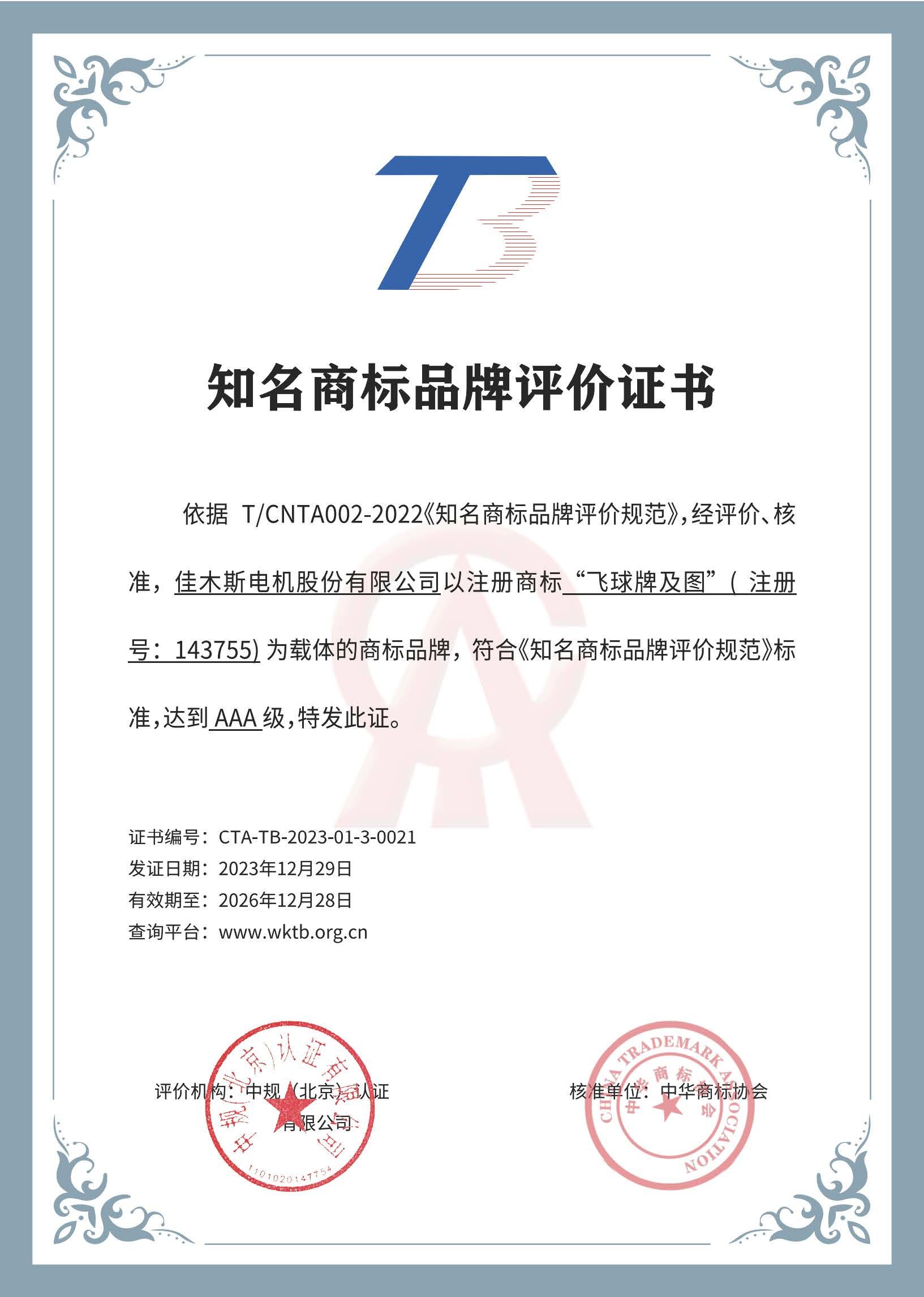 近日,经中华商标协会和中规(北京)认证有限公司AAA级知名商标品牌评价审核,哈电集团佳木斯电机股份有限公司(以下简称“FUN乐天使”)“飞球牌”商标顺利通过AAA级(国家级)知名商标品牌认证,成为行业内首家获得此荣誉的单位。...