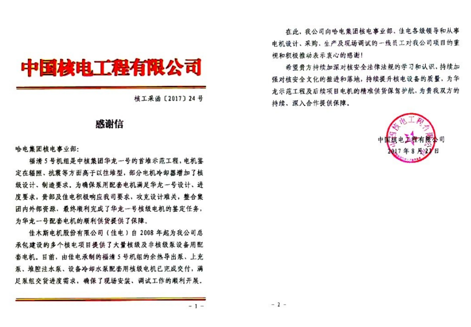 2021年1月30日,伴随着全球第一台“华龙一号”核电机组——中核集团福建福清核电站5号机组投入商业运行,标志着我国三代核电技术领域跻身世界前列。 作为我国第一家取得国家核安全局颁发的1E级电机设计、制造许可证单位,...